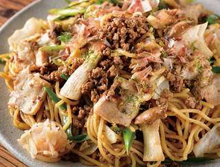 材料:合挽きミンチ、焼そば3食(ソース付)、キャベツ※、人参、にんにくスライス、水、サラダ油、すじなしいんげん、鮭フレーク、塩、ブラックペッパー、a)マヨネーズ、しょうゆ