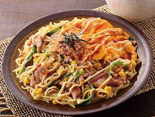 材料:豚小間切れ、焼そば、オクラ、ピーマン、もやし、粒コーン、溶き卵、塩・胡椒、刻みのり
