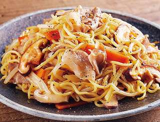 材料:豚こま切れ、生しいたけ、人参、もやし、しょうが(みじん切)、焼そば、油、黒胡椒