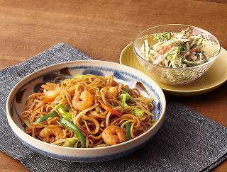 材料:焼そば(ソース付き)、豚こまぎれ、九州産きざみ青ねぎ、たまねぎ、人参、水、サラダ油、絹とうふ、北海道のとろろ芋、なめ茸、わさび・しょうゆ