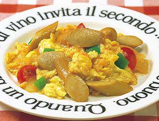 材料:卵、ポークウインナー、ミニトマト、玉ねぎ、ピーマン、にんにく、サラダ油、バター