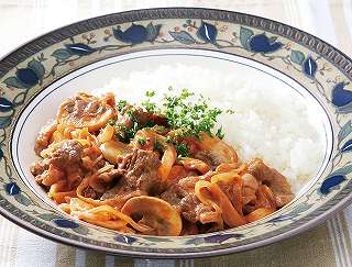 材料:牛こまぎれ、玉ねぎ、マッシュルーム