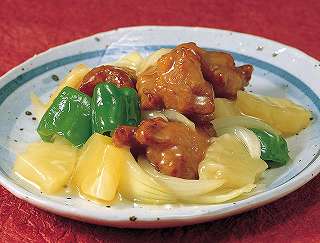 材料:チキンナゲット、揚げ油、玉ねぎ、洋人参、ゆでたけのこ、生しいたけ、パイナップル缶詰、ピーマン、土生姜みじん切、にんにくみじん切、サラダ油、酢、片栗粉