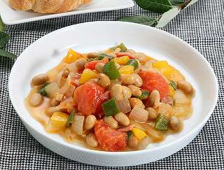 材料:ロースハム、キャベツ、玉ねぎ、サラダ油、水、固形コンソメ、大豆水煮、トマト水煮、塩・胡椒、パセリ(みじん切)