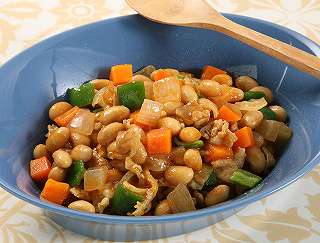 材料:大豆水煮、玉ねぎ、ピーマン、にんにく(うす切)、オリーブ油、豚ミンチ、塩、胡椒