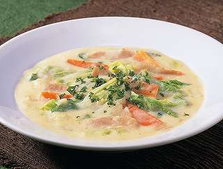 材料:白菜、洋人参、ベーコン、サラダ油、コンソメ、コーンクリーム(缶)、牛乳、塩、胡椒、片栗粉、パセリ(刻む)