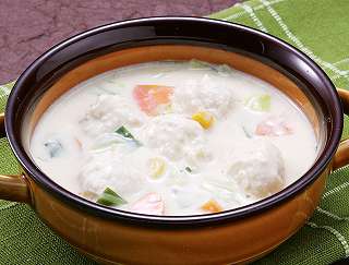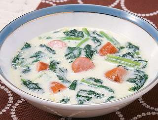 材料:ウインナー、小松菜、コンソメ、コーンクリーム、牛乳、塩・胡椒