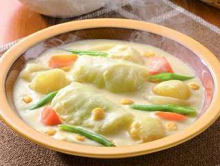 材料:ミニロールキャベツ、じゃがいも、玉ねぎ、人参、いんげん、バター・小麦粉、牛乳、コーンクリーム、塩・胡椒