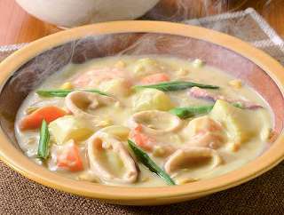 材料:いか(つぼ抜き)、むきえび、じゃがいも、玉ねぎ、人参、いんげん、油・バター・小麦粉、牛乳、コーンクリーム、塩・胡椒
