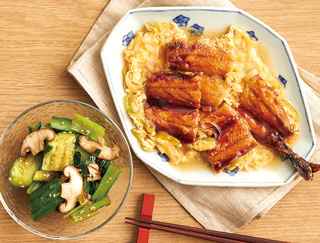 おまかせ献立(2人分)さんまの蒲焼ふんわり卵とじ、しいたけときゅうりのゴマ和え