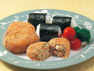 材料:じゃがいも、塩、胡椒、乾燥ひじき、洋人参、玉ねぎ、サラダ油、牛・豚合挽ミンチ、スキムミルク、小麦粉、卵、パン粉、揚げ油、キャベツ、ミニトマト