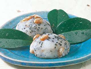 材料:あん、丸餅、片栗粉、甘納豆、いりごま黒