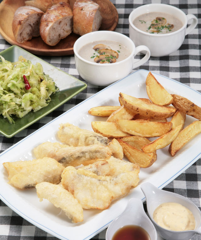 鱈とじゃがいもに衣をつけてカリッと揚げる「フィッシュ&チップス」。手軽に味わえるアイルランドの郷土料理がメインの献立です。