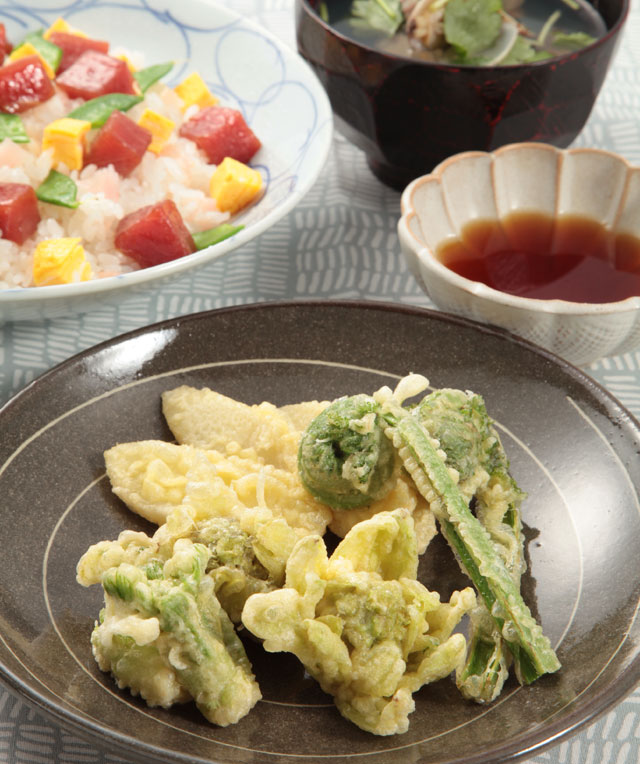 春の味覚、山菜の天ぷらと色鮮やかなまぐろのちらし寿司を合わせたちょっと贅沢な献立です。