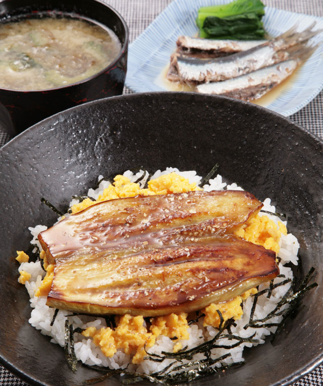 秋にますますおいしくなる「なす」を手作りのタレでうなぎ蒲焼風にしました。とろりと柔らかい「なす」と、タレがしみ込んだご飯がおいしい丼です。いわしの梅煮とお味噌汁で栄養バランスをとりましょう。