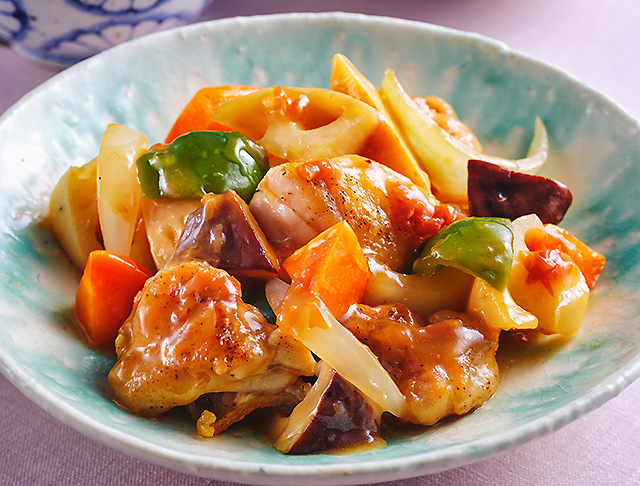 (1)鶏肉はAをふって片栗粉をまぶす。フライパンに油を熱して両面を焼き、取り出す。(2)玉ねぎはくし形切り、ピーマンは種を取って乱切り、しいたけは石づきを取って6等分に切る。人参、れんこん、たけのこは小さめの乱切りにして下ゆでする。(3)フライパンにごま油を熱して野菜を炒め、火が通ったら鶏肉を加える。Bを加えて炒め合わせ、Cを加えてとろみをつける。
