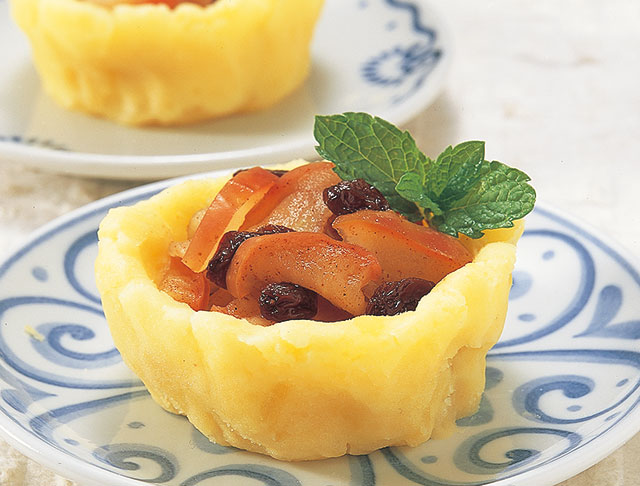 (1)さつまいもは輪切りにして皮をむき、柔らかくゆでて熱いうちにつぶす。Aを加え、火にかけて練る。粗熱が取れたら4等分し、ラップの上に丸く広げてふちを持ち上げ、カップを作る。(2)レーズンはぬるま湯に浸して柔らかくする。りんごは薄いいちょう切りにして砂糖をまぶし、電子レンジ(600w)で約3分加熱する。シナモンを振ってレーズンとまぜる。(3)(1)のカップに(2)を盛り、あればミントを添える。