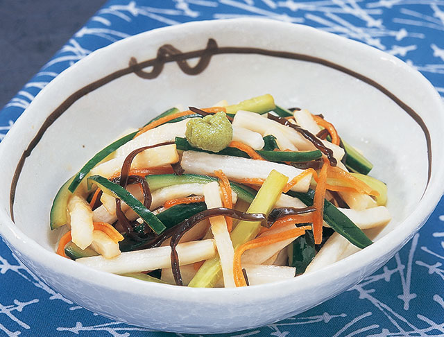 (1)長いもときゅうりは長さ3cmの太めのせん切り、人参は細めのせん切りにする。(2)(1)と塩吹き昆布をよく混ぜ合わせて味をなじませる。器に盛ってわさびをのせる。