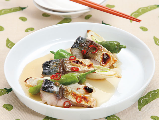 (1)さばは幅3cmにそぎ切りし、皮目に切り込みを入れる。(2)ねぎは長さ4cmの斜め切りにし、ししとうは2ヵ所程軽く切り込みを入れる。(3)グリルでさばと野菜の両面をこんがり焼き、熱いうちにAに浸ける。約30分、味がなじむように浸けておく。※調理時間に浸ける時間は含みません