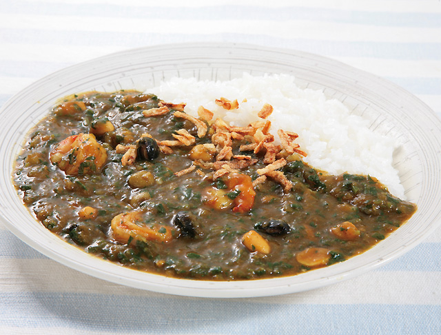 (1)ほうれん草はさっとゆで、長さ1㎝位に切る。えびは片栗粉少々(分量外)で軽くもんで洗い流す。(2)深めのフライパンにオリーブ油とにんにくを入れて火にかけ、香りがしてきたら玉ねぎを加えて弱~中火で焦げないように炒める。玉ねぎが透き通ってきたらほうれん草とえび、ミックスビーンズを入れてさらに炒める。(3)水300mlとコンソメを加えて中火で煮込み、火を止めてカレールウを入れて溶かす。弱火で5分位煮込み、とろみが付いたら皿に盛ったご飯にかける。好みでフライドオニオンを散らす。
