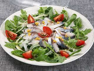 材料:しめさば(うす切)、玉ねぎ、ベビーリーフ、ミニトマト、柚子の皮(すりおろす)
