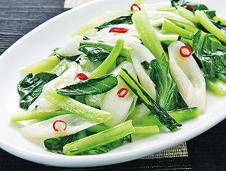 材料:小松菜、チンゲン菜、土生姜、赤唐辛子、ガラスープ、サラダ油・ごま油、塩・胡椒